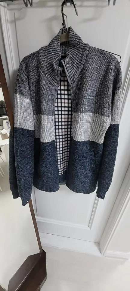 The Men's Fleece Zipper Cardigan combines comfort, warmth, and casual style for the colder seasons. Designed with a plush inner fleece and a contrast striped exterior, this piece keeps you cozy while elevating your everyday outfit. Its full-length sleeves, zip closure, and thick knit finish make it perfect for layering in autumn and winter.